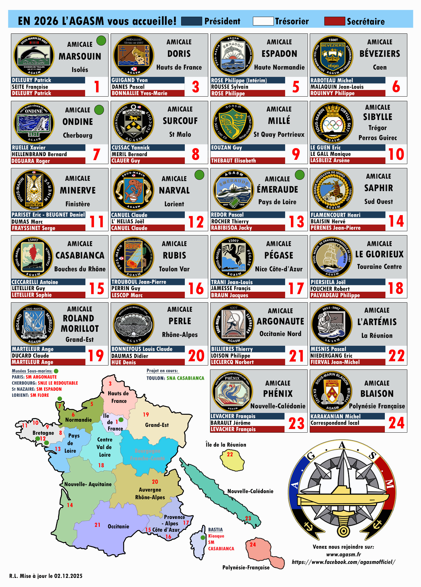 L’AGASM est composée de 19 amicales réparties sur la métropole et 3 amicales situées en Nouvelle Calédonie, à La Réunion et à Tahiti.